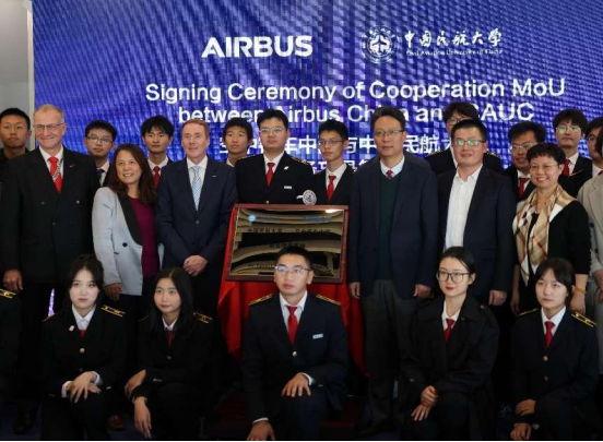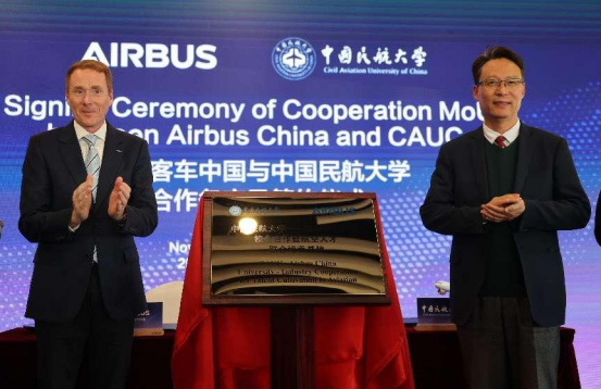 11月9日,中国民航大学与空中客车中国在空中客车天津园区签署共建航空人才联合培养基地备忘录,中国民航大学副校长杨新湦与空中客车国际人力资源高级副总裁裴卓飞(Philippe Pezet)为基地揭牌。国际处、研究生院、学工部、外国语学院等单位主要负责人,中国民航大学学生代表共同参加了签约仪式。