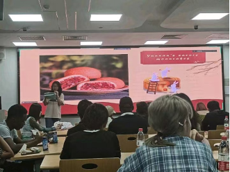 第二场演讲是中国学生包舒敏、王琪婷带来的关于山西特色月饼的分享。从山西空壳月饼的独特名称和外表,到众人试吃时诱人的味道,再到细细品尝其南北方不同的风味特色,随着探讨的逐步深入,空壳月饼差异中的文化交流和文化底蕴渐露真章,也让大家品味到了中秋的幸福点滴。