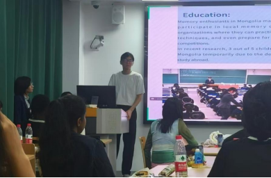 第十一场演讲是外国留学生Altanshagi Munkhsaikhan(金善爱)对于蒙古国(Monglia)的文化与历史的陈述。最先介绍的是蒙古国国旗,三色与花纹的独特意义象征着国家繁荣。随后是众所周知的广阔空旷又崎岖的地形,地理和位置展现了蒙古国独特绝美的景色。随后是其游牧文化和恶劣的天气,建筑上有名的传统居所蒙古包和上千亩绝美绿野。关于历史则讲述成吉思汗与蒙古帝国的渊远和流长,演讲最后则是提到了教育并着重点明了从小培养的记忆力教学和出国留学的热潮。