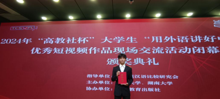 9月29日,2024年“高教社杯”大学生“用外语讲好中国故事”优秀短视频作品征集活动决赛在湖南大学落幕。中国民航大学是唯一一所有2件作品杀入全国决赛并均获得一等奖的高校,成为本次赛事的一大亮点,得到诸多专家与同行的赞誉与肯定。同时,中国民航大学获得优秀组织奖,外国语学院6名学生参与2件作品编排与制作、3位外国语学院与1名马克思主义学院教师参与指导,外国语学院张长颉副教授现场获得优秀指导教师奖。