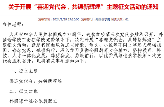9月29日,在中华人民共和国成立75周年之际,外国语学院面向全院师生发布关于开展“喜迎党代会、共铸新辉煌”主题征文活动的通知,号召全院师生以诗歌、散文、小说等不同文字形式祝福祖国、感念党恩,砥砺前行,深入学习贯彻全国教育大会精神,坚持教育、科技、人才一体化发展,凝心聚力促发展,踔厉奋发谱新篇,以实际行动迎接学校第三次党代会胜利召开。
