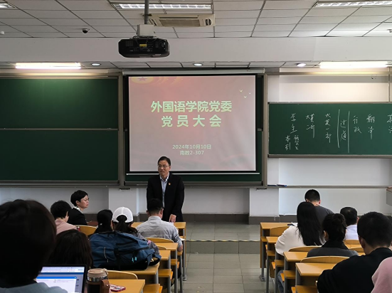 10月10日中午,外国语学院党委在南教2-307教室召开党员大会,号召全体师生党员以喜迎学校第三次党代会为契机,凝心聚力振精神,奋勇争先创佳绩,深入推进党建和业务深度融合,坚决打好本科教育教学审核评估攻坚战,坚决写好巡察整改“后半篇文章”,切实以高质量党建引领高质量发展,为建设中国特色世界一流民航大学贡献外院力量。