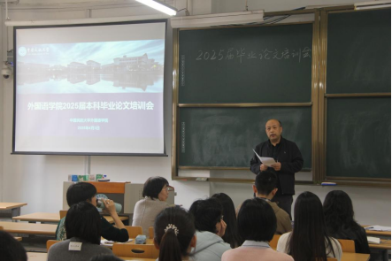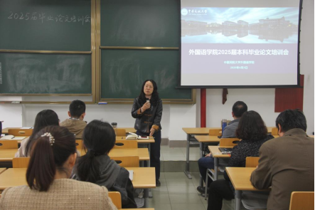 4月3日下午,外国语学院在南教1-113教室组织召开2025届本科毕业论文指导工作专题培训会。邀请学校教务处教学质量管理科周立春老师作专题辅导,英语专业负责人、学院近50名毕业论文指导教师参加此次培训会。