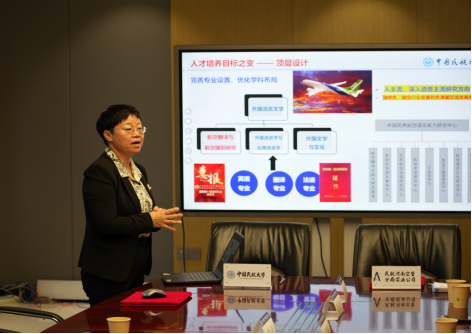 挂牌仪式上,外国语学院院长张艳玲介绍了学校发展概况以及学院在学科建设、行业服务和人才培养等方面所取得的成绩,重点阐述了“外语+民航”的复合型语言服务人才培养理念和具体举措。