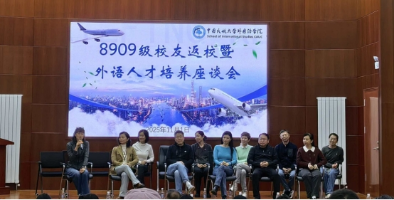 当日下午,外国语学院面向全体2025级新生在图书馆大报告厅举办外语人才培养座谈会。93届11位校友代表、院党委书记朱瑞新、院长张艳玲出席,院党委副书记魏伟主持座谈会。