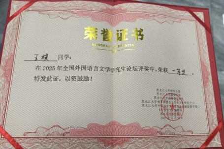 近日,在由黑龙江大学研究生院、外语学部和《外语学刊》(CSSCI南大核心期刊、北大核心期刊)联合主办的2025年全国外国语言文学研究生论坛上,我院2025级外国语言文学硕士研究生王棋同学凭借其扎实的研究成果和出色的现场表现,在“语言学研究组”的汇报中脱颖而出,荣获论坛最高奖项(一等奖第一名)的优异成绩。