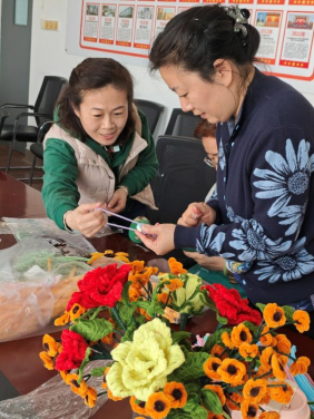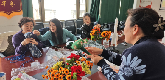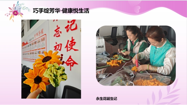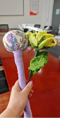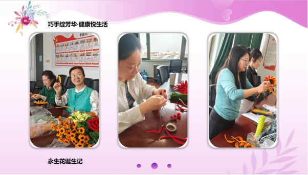 活动现场气氛热烈,欢声笑语不断。本次手工体验涵盖两大特色项目:“扭扭棒永生花”制作与“艾草养生锤”制作。参加活动的老师们充分发挥创意,将一根根普通的扭扭棒巧妙编织成色彩缤纷、栩栩如生的永生花束。永不凋谢的花朵象征着女性永恒的魅力与坚韧的生命力,每一束作品都凝聚着独特的审美与匠心。