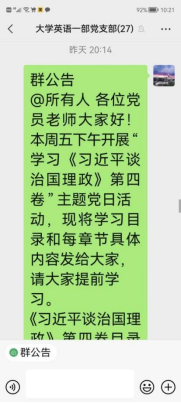 会前,为扎实系统学习《习近平谈治国理政》第四卷,支部委员会召开线上会议,部署学习方案。支委会上,委员们明确分工,在共产党员网和视频网站查找权威学习资料,提前将原文、评论、视频和其他相关学习资料发到支部,支部教师做好会前预习与自学。随后,按照本书的21个专题,109篇讲话、谈话、演讲、致辞、指示、贺信列出学习提纲,在支部群发布共享文档,要求支部党员填写文档,选择1篇文章,自学备课,在集中学习时进行宣讲和学习心得分享。