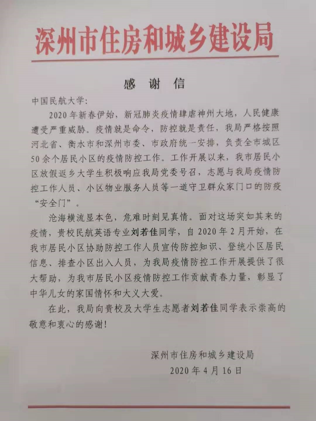 担任志愿者期间,刘若佳在小区物业办公室帮助录入住户信息,帮助检查修正物业通知的文件并发送到小区住户交流群中,与物业工作者交流沟通小区里的防疫措施问题,协调好小区内的每一位住户,获得住户对物业工作安排的支持,在出入口组织进行合理有效的人员出入检查程序并合理将物资进行分配。志愿工作结束之后,刘若佳感慨良多,既为抗击疫情贡献了自己的力量,又收获了自己沟通交流、为人处事的成长。收到来自深州市住房和城乡建设局的感谢信,她表示自己更要感谢那些在全民停工期间仍然坚持工作的抗疫工作者,“向所有默默在自己岗位上为疫情奉献的人致敬,正是有了他们,我们国家才能顺利度过这次灾难,也正是有了他们,让我们在疫情最严重的那段时间更增强了对国家抗击疫情成功的信心。”