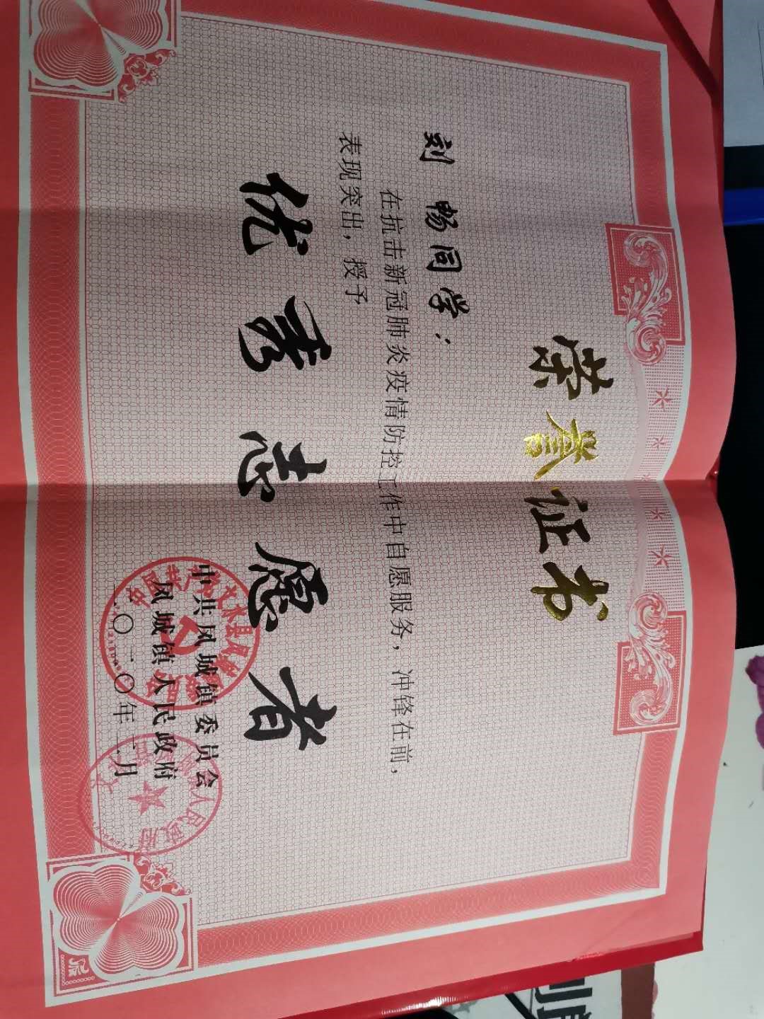 作为志愿者,刘畅在抗击疫情工作中,无怨无悔,服务社会,传递爱心,受到了社区领导的好评,得到了文水县凤城镇党委政府的表彰,用行动书写自己的无悔青春,在自己平凡的岗位上不惧困难,在疫情防控中发挥着自己微薄力量,让人敬佩。
