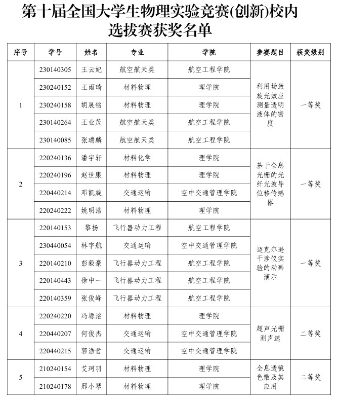 在学校组织的第十届全国大学生物理实验竞赛校内选拔赛中,共36支队伍,154名学生参赛,经评选一等奖三项,二等奖四项,三等奖五项,