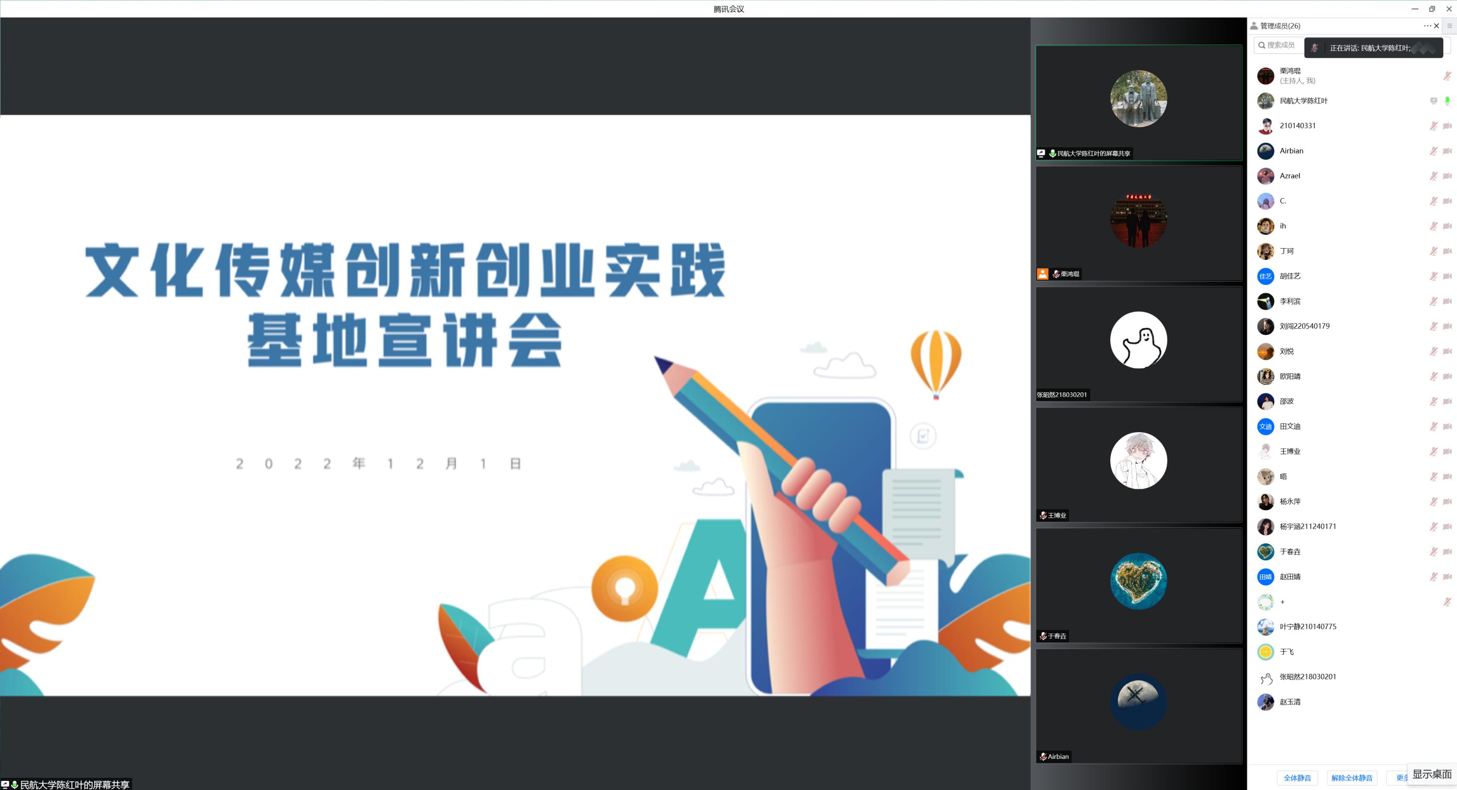 12月1日,由宣传部负责的文化传媒创新创业实践基地于线上召开了2023年项目征集宣讲会。基地负责人从基地定位,项目征集范围,项目申报流程,系统操作四个模块进行展开。