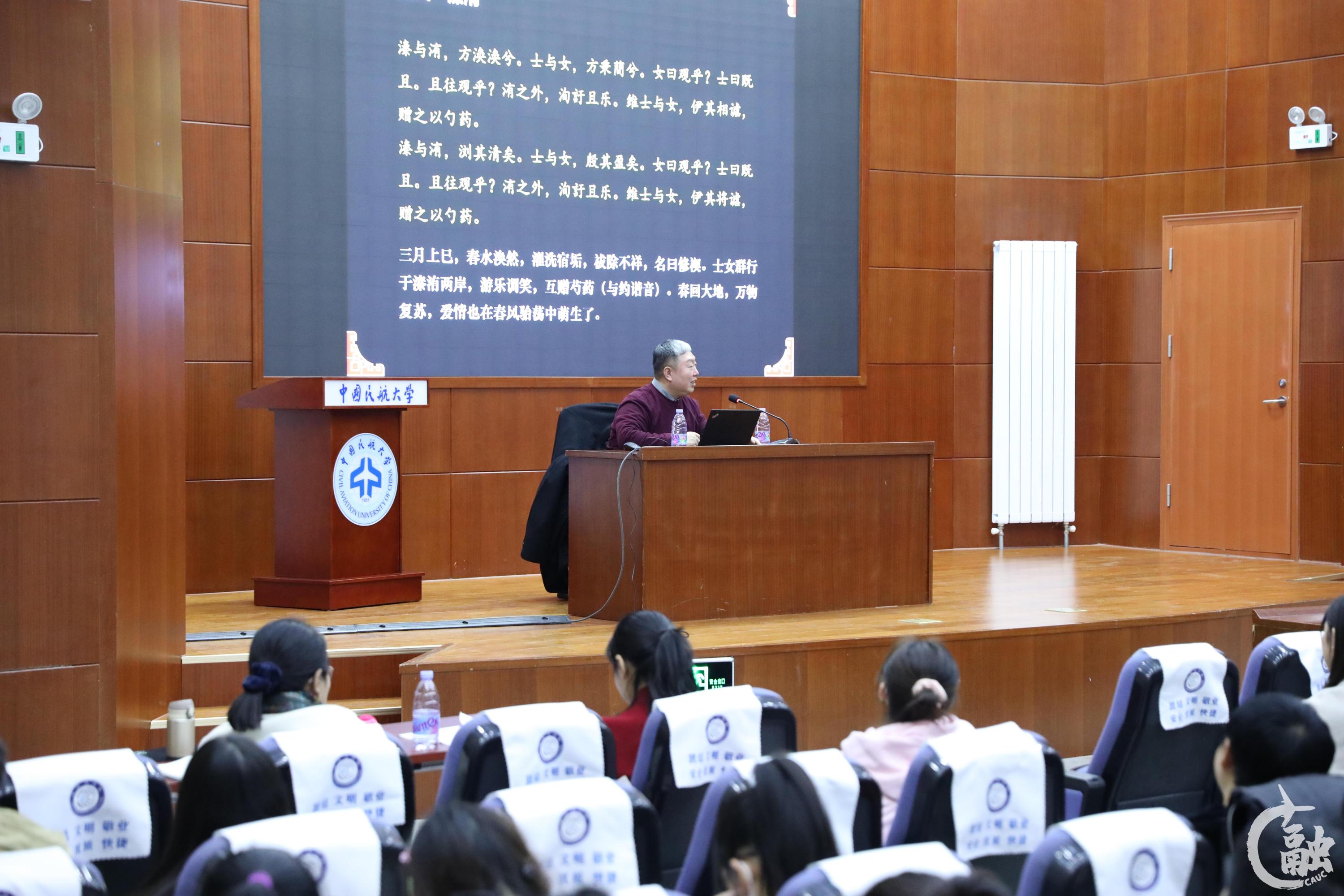 3月3日,中国民航大学首期“蓝天修身文苑——中华优秀传统文化周末大讲堂”在东丽校区南区圆形报告厅开讲。南开大学文学院院长,教授,博士生导师,教育部中文专业教学指导委员会副主任委员沈立岩作题为《<诗经>中的情感之美》专题讲座,吸引百余名学生聆听,现场座无虚席。