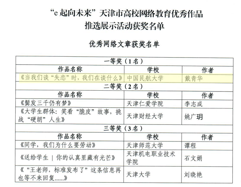 中国民航大学辅导员戴青华创作的《当我们谈“失恋”时,我们在谈什么》在“e起向未来”优秀网络作品展播暨2023年度天津市大学生网络文化节和天津市高校网络教育优秀作品推选展示活动中获优秀网络文章一等奖,宣传部教师栗鸿琨创作的《追光青春 心归少年》获优秀新媒体作品三等奖。
