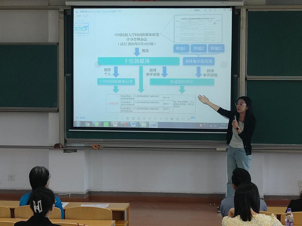 栗鸿琨对《中国民航大学校园新媒体联盟评分管理办法(试行)》进行详细解读,对“十佳新媒体”“十佳校园新媒体记者”“先进组织单位”的评选流程进行逐一讲解,明确参评条件、评分指标等内容,鼓励各阵地积极投稿,创作更多优质新媒体稿件。