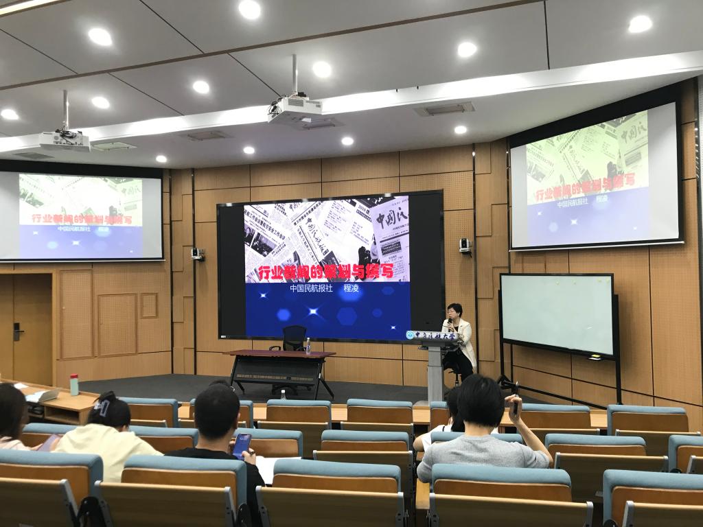 程凌首先介绍了中国民航报社的全媒体矩阵,强调了新闻工作者需要具备跨平台的业务能力。随后,她讲解了《中国民航报》的版面设置和不同版面的内容定位,指出新闻稿件的写作必须符合相应版面的特点。她重点讲解了消息和通讯两种文体的基本架构、写作技巧,并对典型民航新闻案例进行深度剖析,帮助师生学会如何挖掘新闻点、如何简洁明了地传达新闻信息。她还从新闻策划、素材要求两个方面帮助师生了解如何做好重大新闻的融媒体报道。