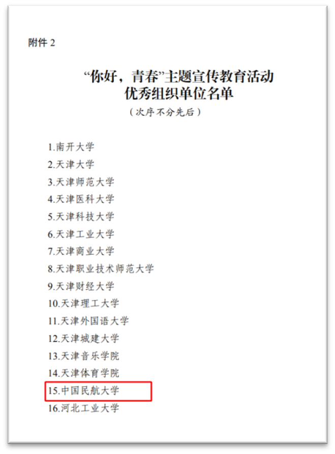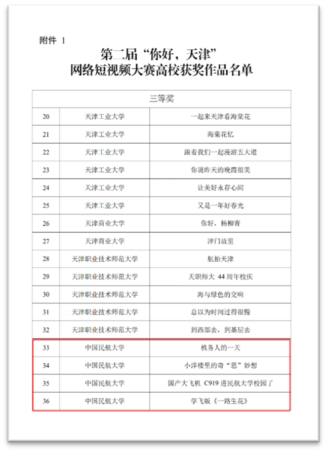 近日,第二届“你好,天津”网络短视频大赛圆满落幕。由中国民航大学校党委宣传部策划创作的《小洋楼里的奇“思”妙想》《国产大飞机C919进民航大学校园了》,飞行分校、杰普逊国际飞行学院策划创作的《一路生花(学飞版)》《机务人的一天》分别荣获大赛三等奖。本届大赛自2023年6月份启动以来共收到投稿作品43.9万件,全网累计播放量94.7亿次。学校在市教育两委依托大赛开展的“你好,青春”主题宣传教育活动中荣获“优秀组织单位”。