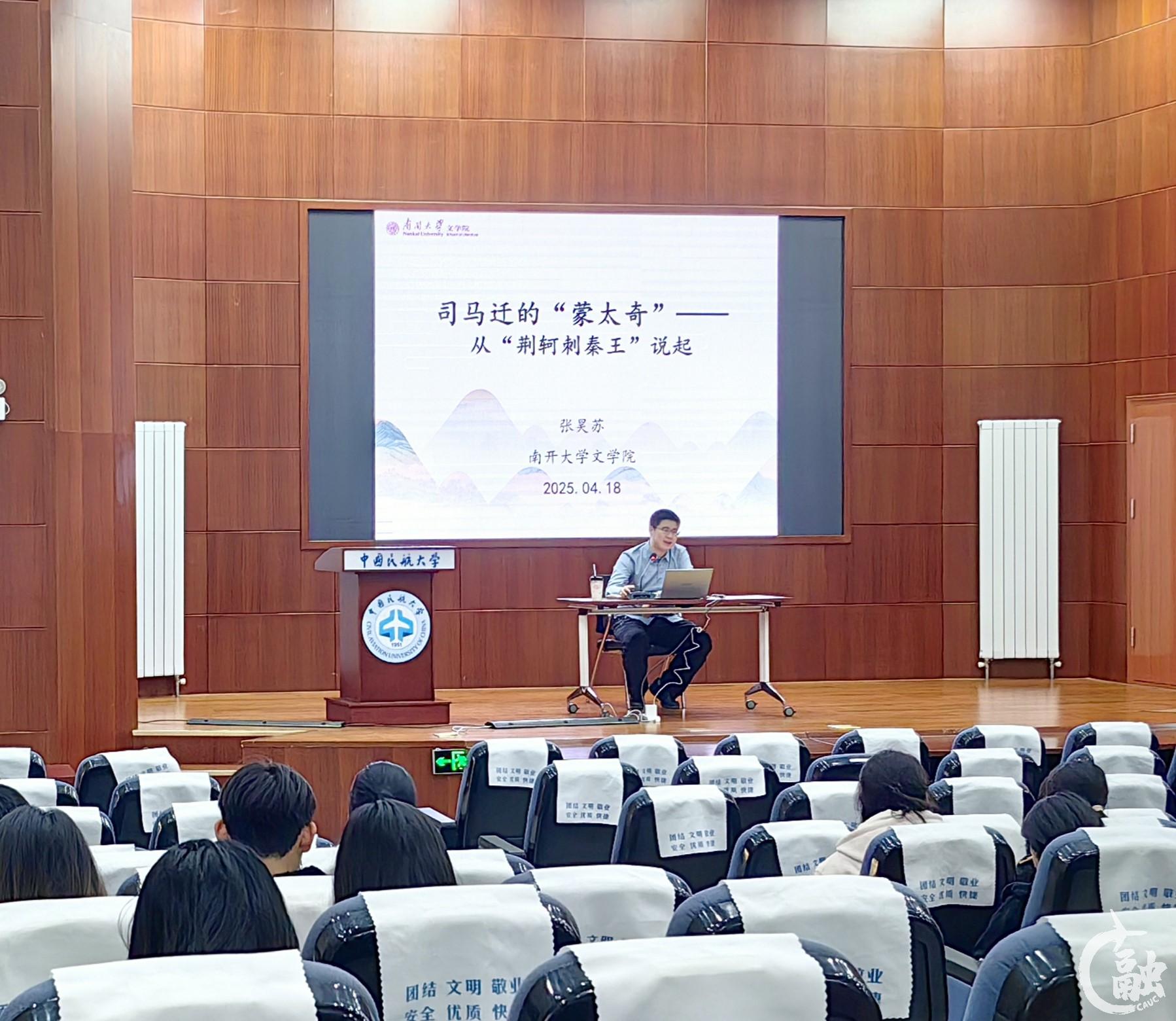 本网讯 4月18日,中国民航大学2025年第二期“蓝天修身文苑——中华优秀传统文化大讲堂”在东丽校区图书馆圆形报告厅开讲,南开大学文学院副教授张昊苏作题为《司马迁的“蒙太奇”——从“荆轲刺秦王”说起》的专题讲座。
