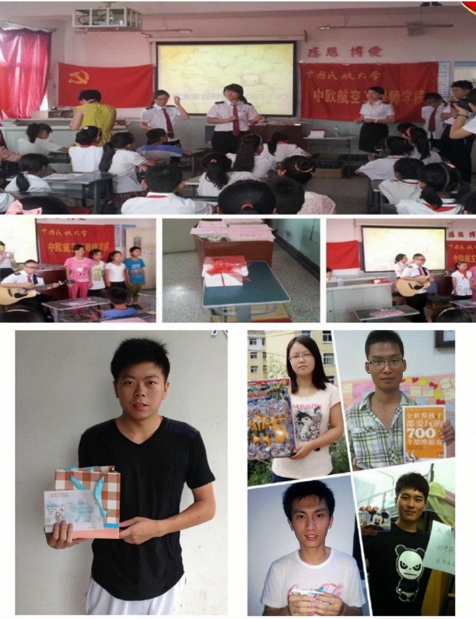 王瑞昕(左下角)在本科时期作为学生党员带队开展义务支教与民航知识普及活动