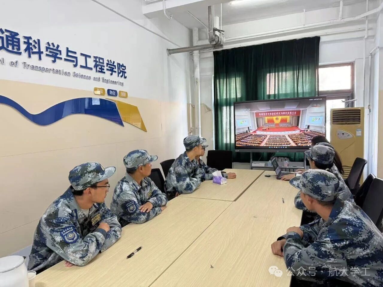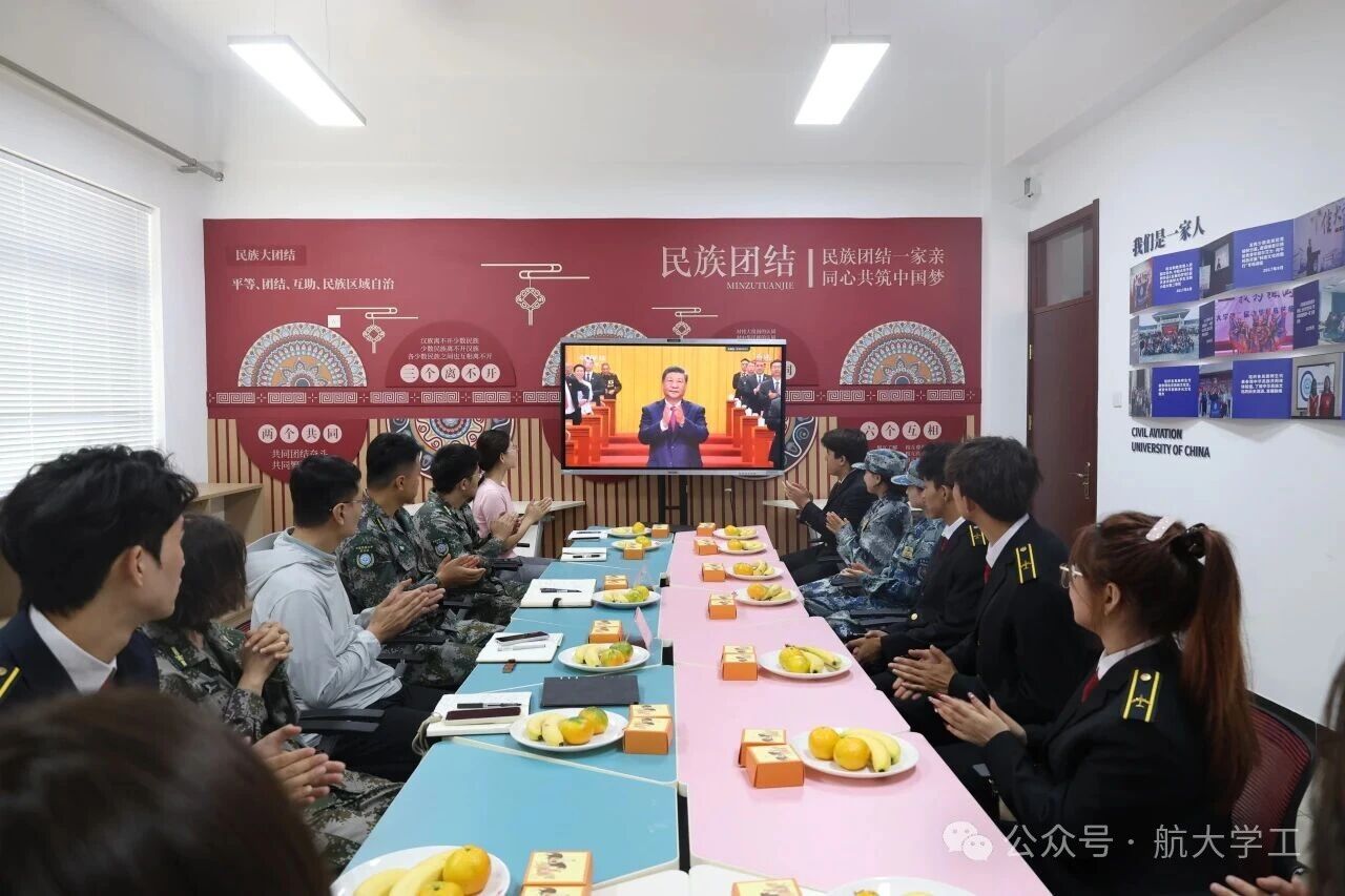2025年9月25日上午,新疆维吾尔自治区成立70周年庆祝活动隆重举行。党委学工部、统战部及学院各民族师生代表在“中航大石榴籽” 民族团结进步工作室集中观礼,并组织召开了座谈交流会。在分会场,各学院组织师生代表同步开展观礼活动,民族团结的种子在中航大校园深深扎根。