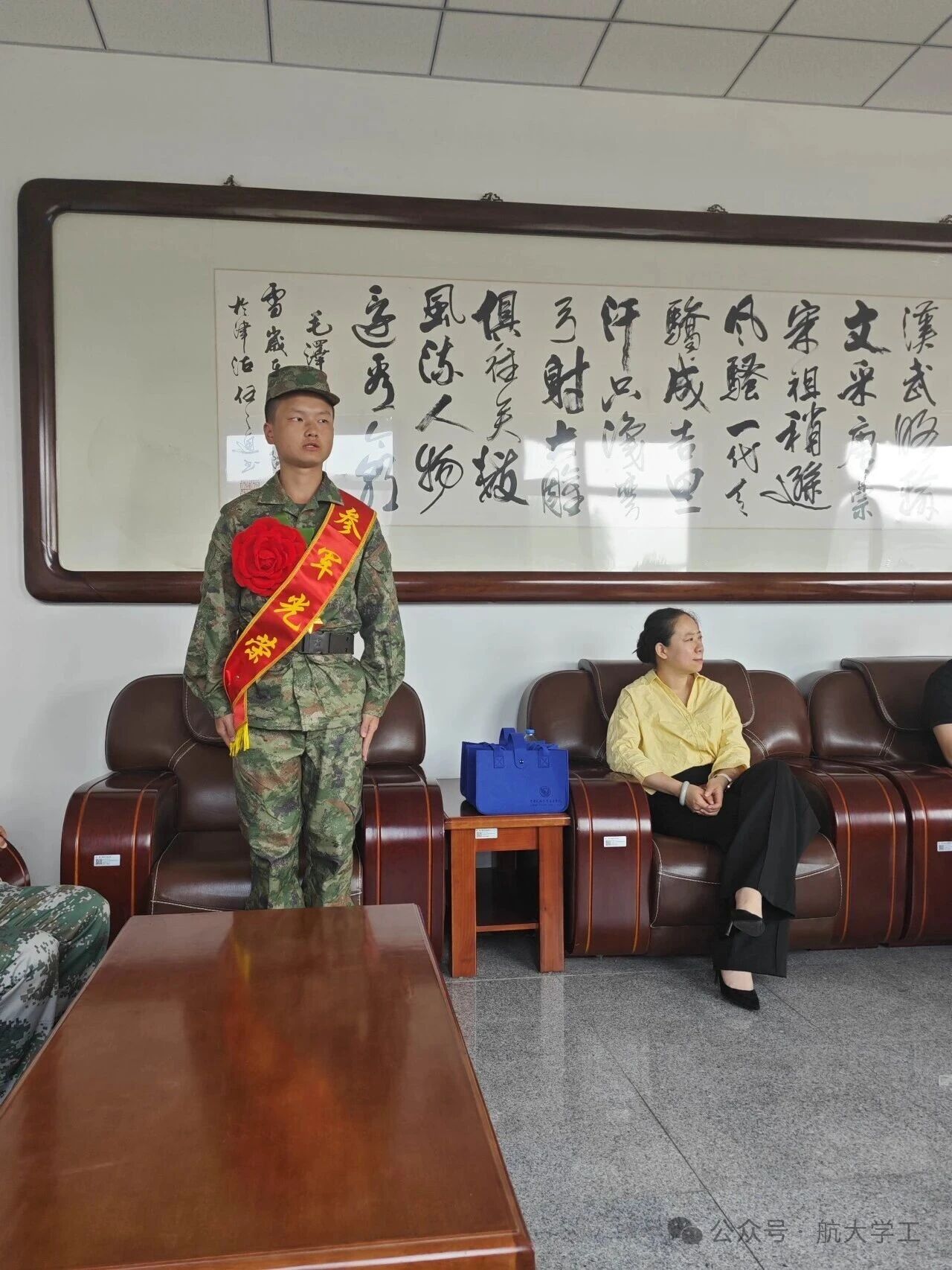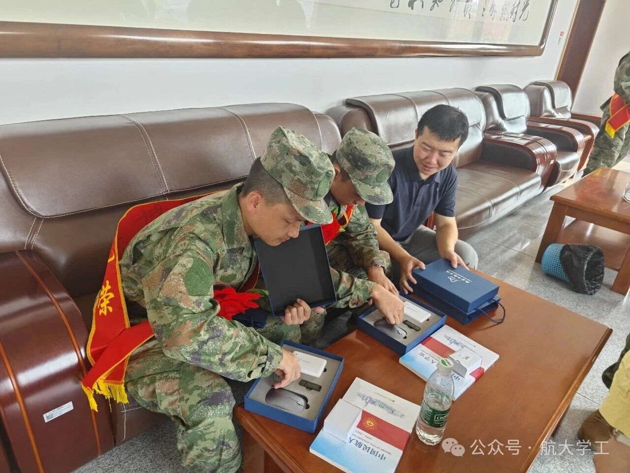 欢送仪式上,学校为11名新兵准备了饱含深情的纪念礼物——每人获赠一本《中国民航大学史》,一枚精致校徽胸章及各学院辅导员精心准备的座右铭摆件。