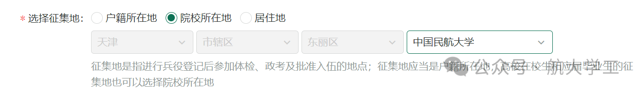 2、如选择在学校所在地参军入伍,应征地为:天津市 东丽区 中国民航大学