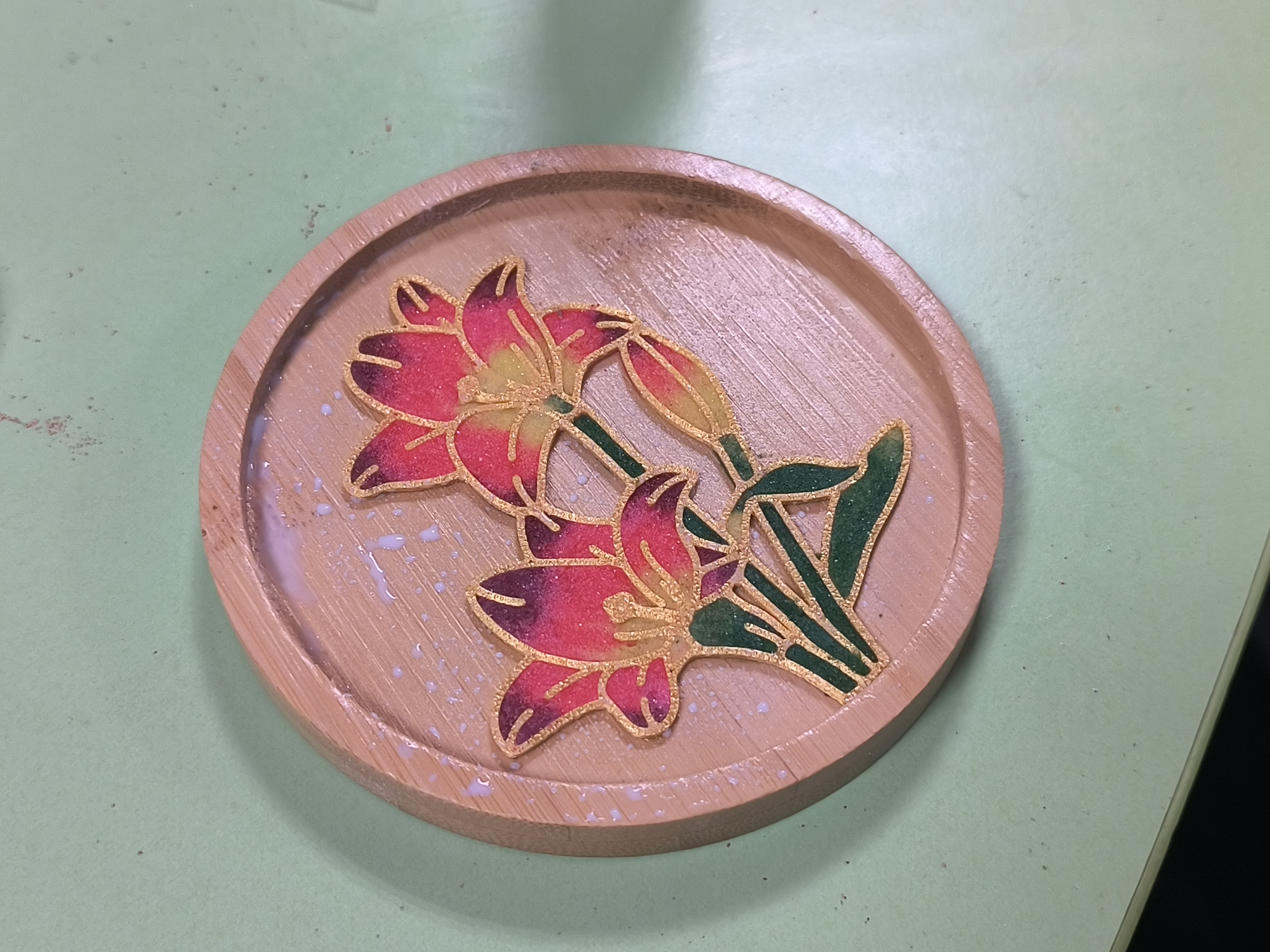 “粘丝的时候要屏住呼吸,点蓝要仔细搭配颜色,不知不觉就沉浸进去了。”计算机学院的侯同学笑着说:“平时被论文和考试围着,总觉得很焦虑,但今天一下午都很放松,看着空白底板变成色彩斑斓的杯垫,所有烦恼好像都跟着消散了。”经济与管理学院的李同学说:“掐丝珐琅刚好需要慢下来,细金丝要一点点粘稳,彩砂要一勺勺铺匀,哪怕线条歪了一点、颜色填错一处,都要耐心调整。这个过程里,我完全放下了压力,眼里只有手中的杯垫。当最后完成时,看着阳光下流光溢彩的成品,那种踏实的治愈感,是刷题和训练里得不到的。”