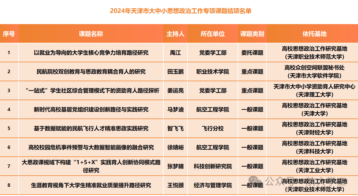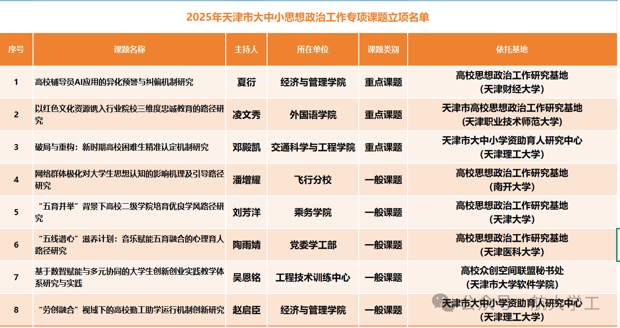 日前,市委教育工委、市教委正式公布了2024年度天津市大中小思想政治工作专项课题结项及2025年度立项名单。我校在2024年度研究基地课题共有8项结项(1项委托课题、2项重点课题和5项一般课题),全部顺利通过验收;2025年度课题共有8个项目获得立项,其中3项重点课题、5项一般课题。至此,我校已连续两年维持高位立项水平,立项总数较2023年实现显著跨越,体现了我校思政研究工作的扎实进步与持续活力。