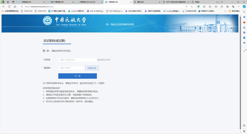 校园网账户密码过期/忘记密码修改通过自助修改密码系统实现,支持校园网用户在校内、校外网络环境下,直接使用手机号重置密码或更改绑定的手机号,具体链接https://resetpwd.cauc.edu.cn/,在民航大学首页最下方快速链接,网络安全和信息化办公室网站,“航大网信”公众号均可找到相应链接。具体操作步骤如下: