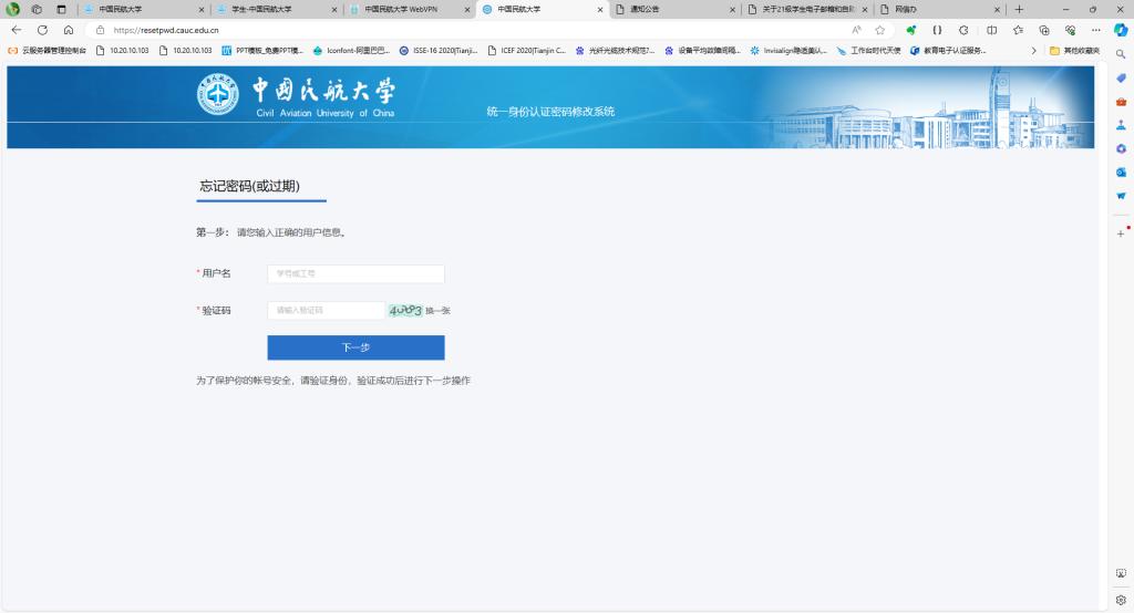 第一步浏览器访问https://resetpwd.cauc.edu.cn/,输入正确的校园网账户(学生为学号,教工为姓名相关的办公账号),确保不含空格或中文字符;输入验证码,点击“下一步”,具体页面如下图。