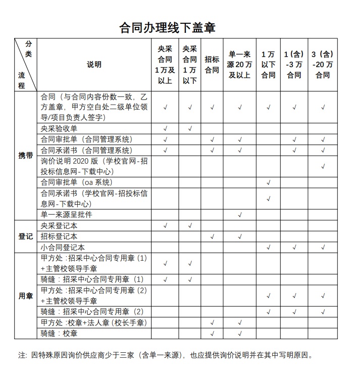 携带相关材料→交服务中心窗口登记→盖招标采购中心合同章业务专用章(1)+分管校领导手章(央采)、招标采购中心合同章业务专用章(2)+分管校领导手章(1-20万合同)