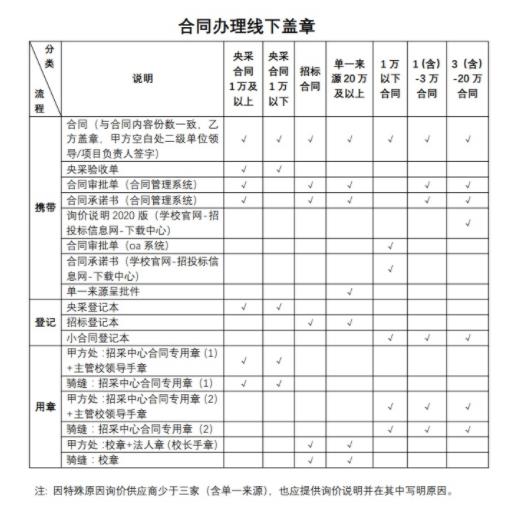 携带相关材料→交服务中心窗口登记→用招标采购中心合同章业务专用章(1)+分管校领导手章(央采)、招标采购中心合同章业务专用章(2)+分管校领导手章(1-20万合同)