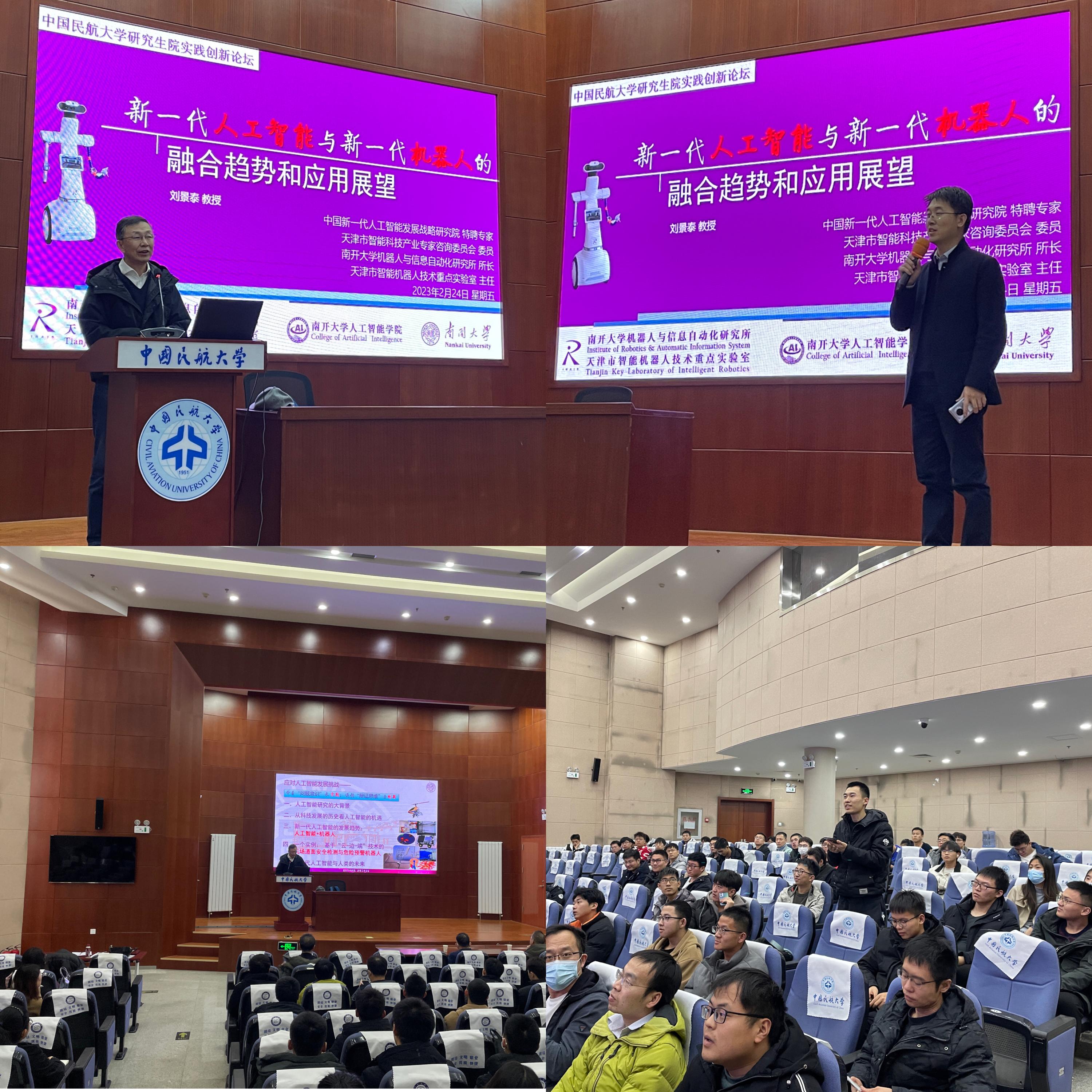 本期实践创新讲坛邀请了中国新一代人工智能发展战略研究院特聘专家、天津市智能科技产业专家咨询委员会委员、南开大学机器人与信息自动化研究所所长、天津市智能机器人技术重点实验室主任刘景泰教授,为师生作了题为《新一代人工智能与新一代机器人的融合趋势》的讲座,讲座由计算机科学与技术学院副院长李海丰主持,吸引了来自计算机、安全、交通、电动、航空工程等学院的100余名师生参与。