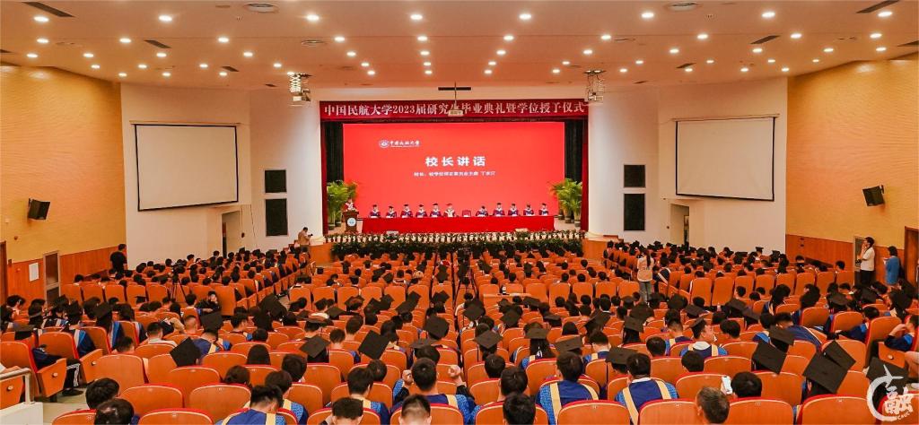 6月7日下午,中国民航大学2023届研究生毕业典礼暨学位授予仪式在东丽校区北区礼堂举行,6名研究生被授予安全科学与工程学科工学博士学位,981名研究生被授予硕士学位,其中66名荣膺研究生优秀毕业生。校党委书记曹胜利,校长丁水汀,副校长白杰、吴仁彪,校党委副书记赵洪海,副校长杨新湦,校党委常委、工会主席王志强出席。研究生院,各研究生培养学院领导及导师代表,全体2023届研究生毕业生及部分学生家长参加仪式。