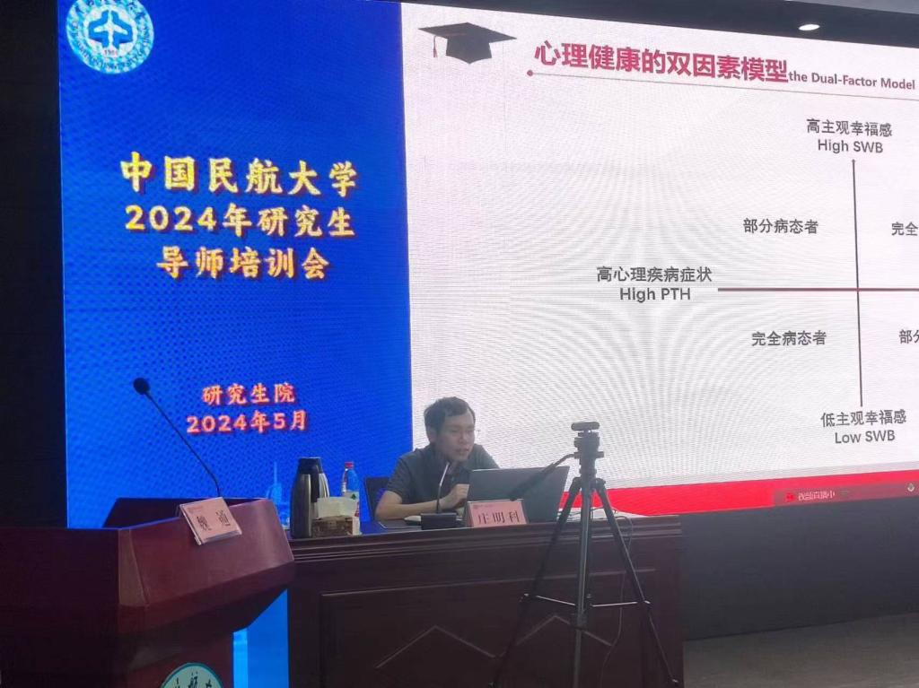 接着,由北京大学学生心理健康教育与咨询中心副主任庄明科副教授作了题为《研究生导师深度辅导技巧和导学关系促进》的报告,报告以心理健康双因素模型和PERMA理论等专业心理学知识为基础,通过深入浅出的讲解,为导师有效指导研究生,营造良好的导学关系,处理常见心理问题,建设科研团队提供了深入指导。