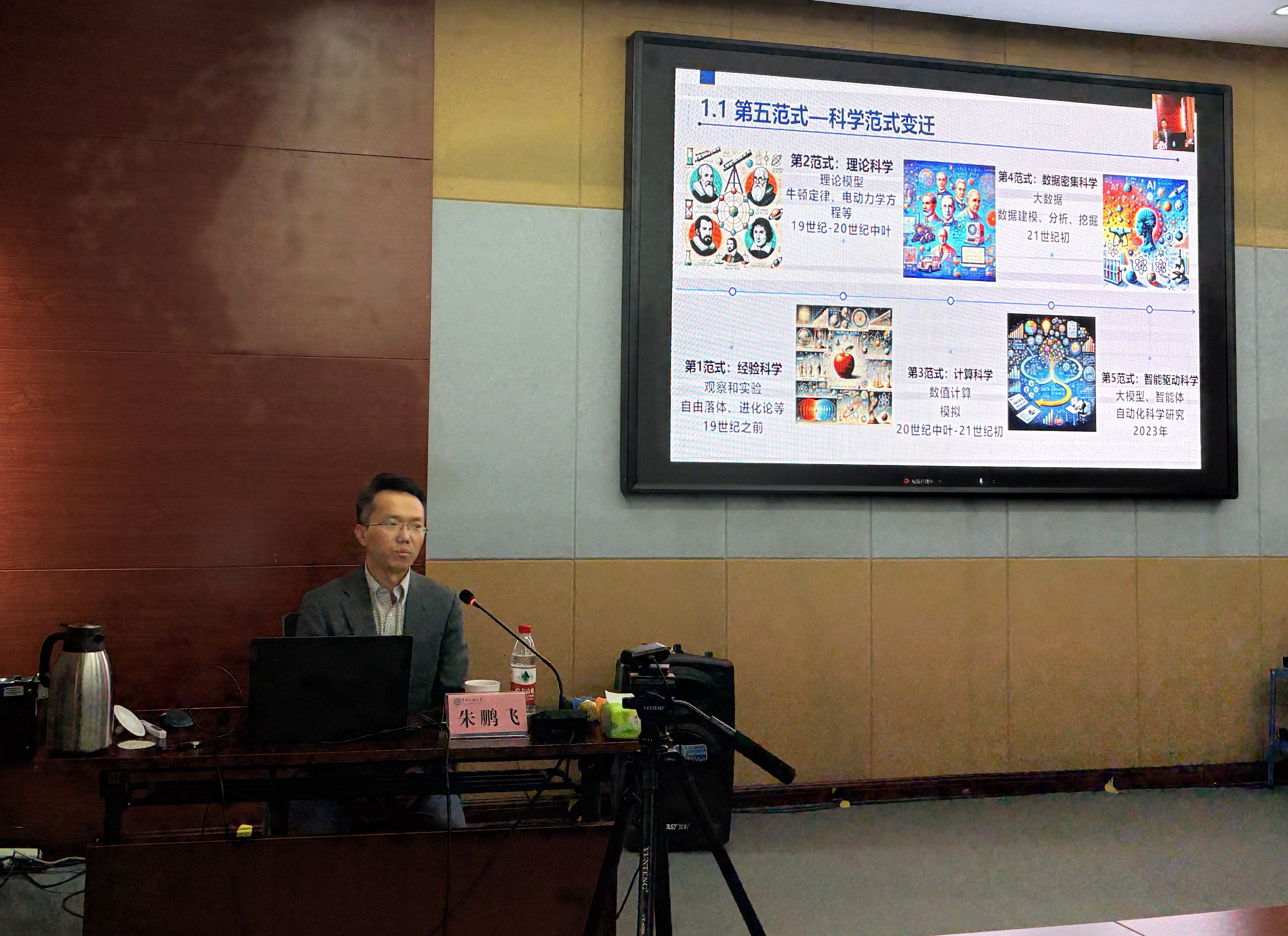 讲座中,朱鹏飞教授以科学范式变迁史为切入点,介绍由人工智能驱动的第五科研范式的形成和发展过程,并以“群体智能”研究为例,详细拆解了大模型在科学假设生成、代码开发及论文撰写中的实践路径。他强调,面对百花齐放的大模型时代,AI工具的应用需以科研诚信为根基,研究者需深度参与理论验证与结果研判,实现人机优势互补。