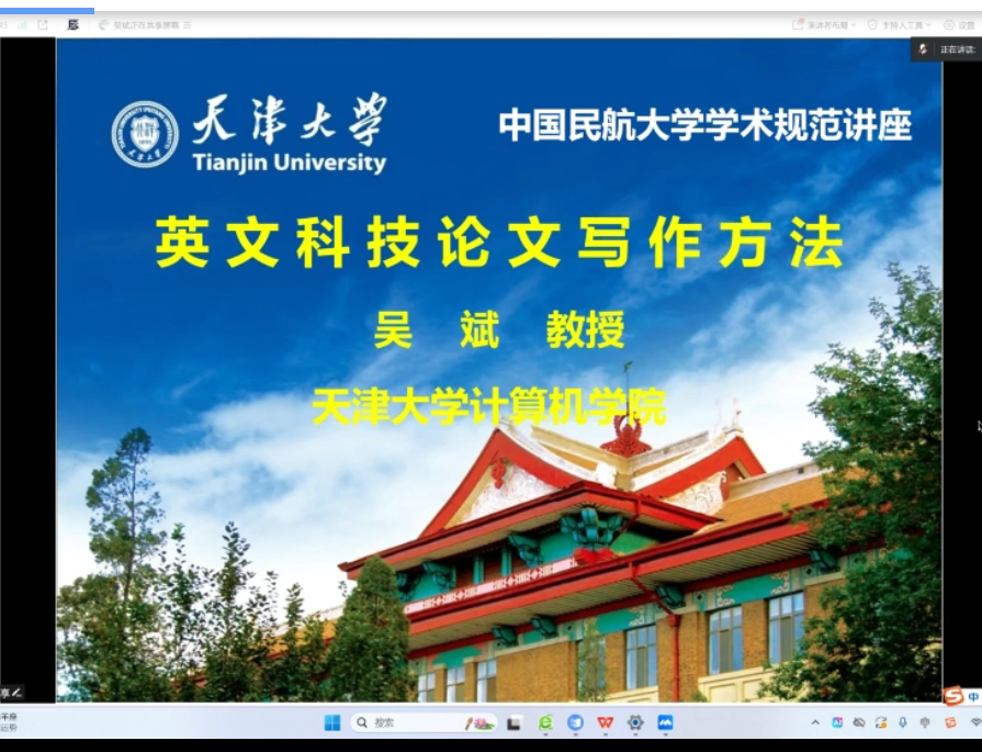 近日,由研究生院主办的学术道德与学术规范主题系列讲座第二十期如期开讲。本期讲座特邀天津大学计算机学院吴斌教授作题为“英文科技论文写作方法”的报告,全校研究生通过长江雨课堂与腾讯会议同步听课。