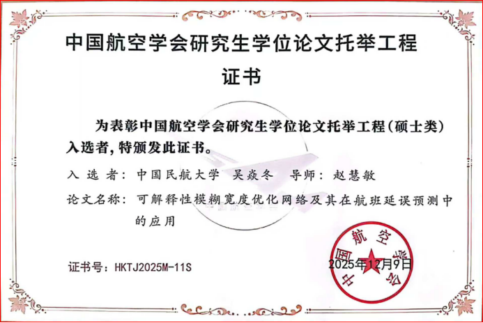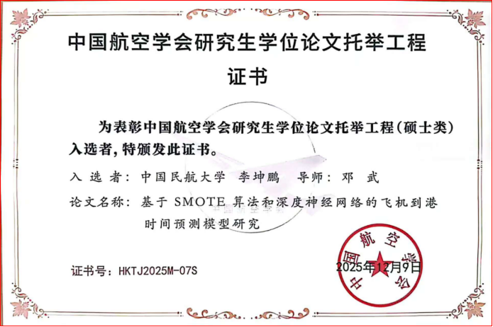 近日,中国航空学会2025(第八届)中国航空科学技术大会与中国航空教育学会2025年年会相继召开,学校研究生学位论文评选再传捷报,共有3篇硕士学位论文获得全国学会表彰。其中,邓武教授指导的硕士研究生李坤鹏的学位论文《基于SMOTE算法和深度神经网络的飞机到港时间预测模型研究》和赵慧敏教授指导的硕士研究生吴焱冬的学位论文《可解释性模糊宽度优化网络及其在航班延误预测中的应用》入选2025年度“中国航空学会研究生学位论文托举工程”(全国仅15篇),张志强副教授指导的硕士研究生于子鸣的学位论文《激光熔覆耐磨减摩钛基复合涂层微观组织与摩擦学行为研究》(校外导师胡寿丰,中国航发商用航空发动机有限责任公司首席专家)获评首届中国航空教育学会“工程类范例学位论文”(全国仅9篇)。