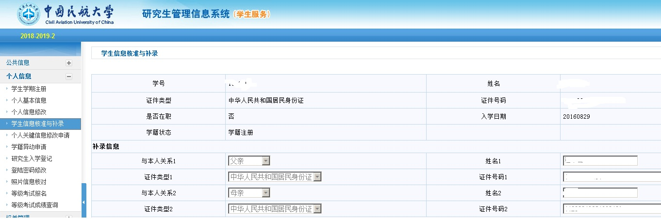 研究生数据信息核准和补录工作事关学生及家庭的切身利益(关系到监护人个人所得税专项附加扣除),按照学生和家长自愿原则,各位同学尽快补录父母或监护人信息,截至时间2019年2月20日16:00,逾期不填的视为学生本人自愿放弃。