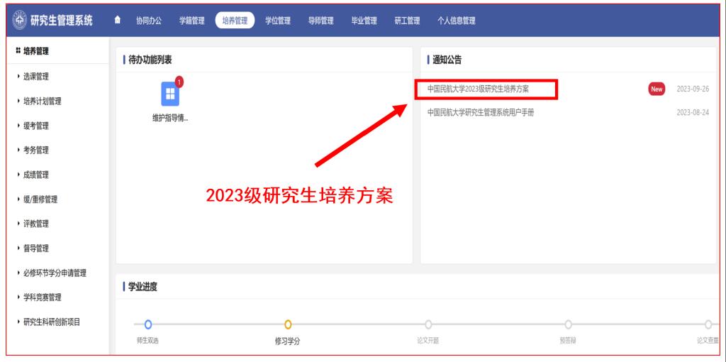 2023级研究生登录“研究生管理系统”(网址:https://yjsgl.cauc.edu.cn),在系统首页“通知公告”栏目查询2023级研究生培养方案,根据所在学科专业研究生培养方案要求制定个人培养计划。