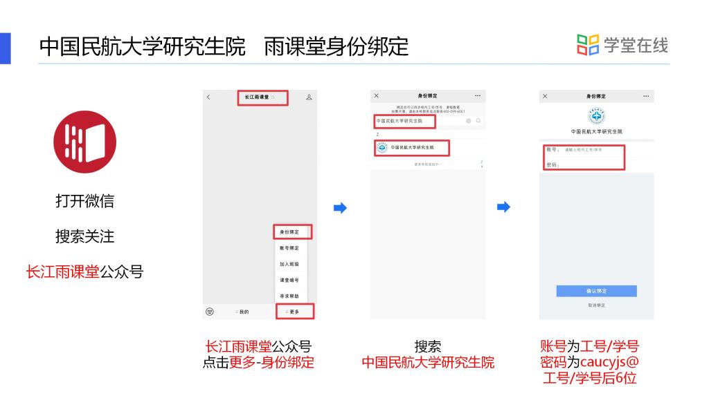1. 参加培训学生需提前在长江雨课堂公众号完成身份绑定(未成功绑定学生无法参加培训),培训当天学生可通过长江雨课堂公众号或小程序进入《中国民航大学研究生院在线课程开课培训》参加。