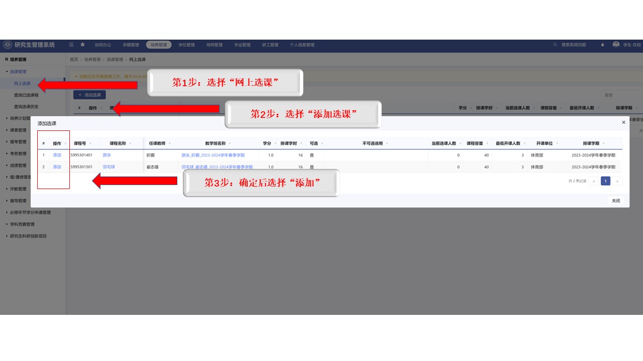 研究生登录研究生信息管理系统进行课程选择(培养管理-网上选课-添加选课),具体选课操作见下图。