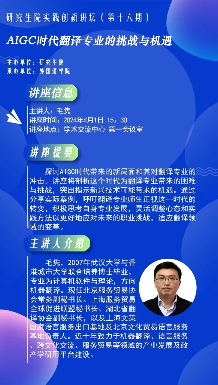 讲座主题:AIGC时代翻译专业的挑战与机遇