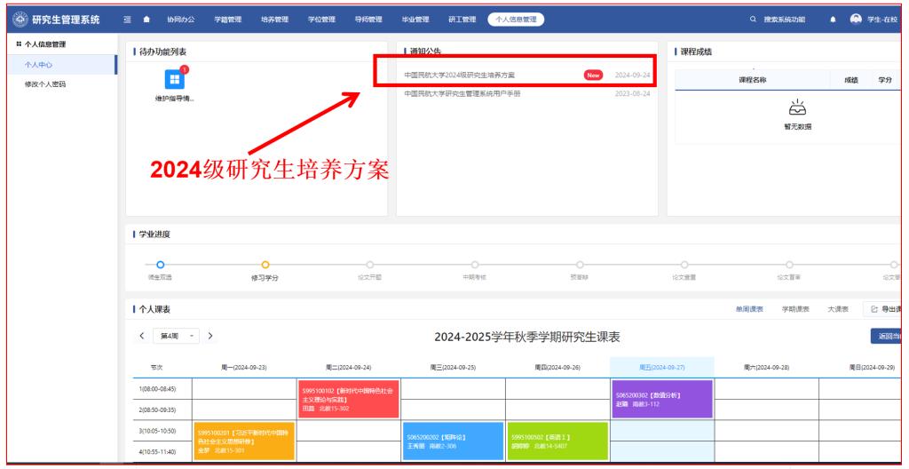 2024级研究生登录“研究生管理系统”(网址:https://yjsgl.cauc.edu.cn),在系统首页“通知公告”栏目查询2024级研究生培养方案。