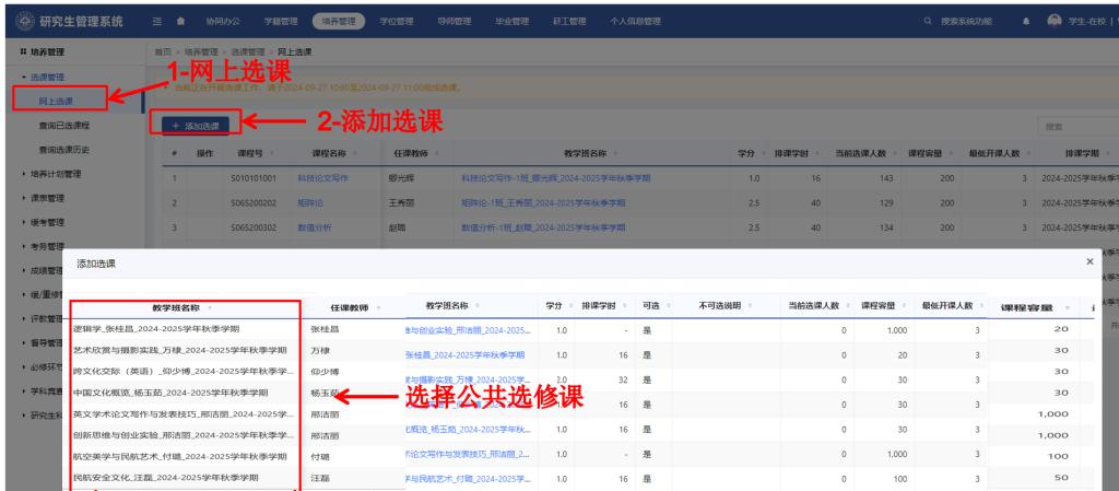 2024级研究生在系统首页“培养管理”模块下,选择“选课管理”,依次点击“网上选课”-“添加选课”,根据个人兴趣确定所修公共选修课。