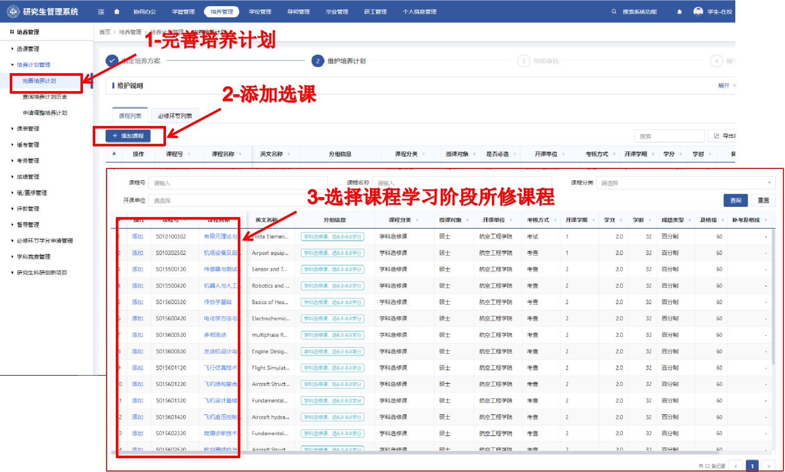 按照培养方案的要求,根据所在学科专业研究生培养方案要求制定个人培养计划。个人培养计划的制定由两部分组成,分别为确定公共选修课和确定专业选修课。