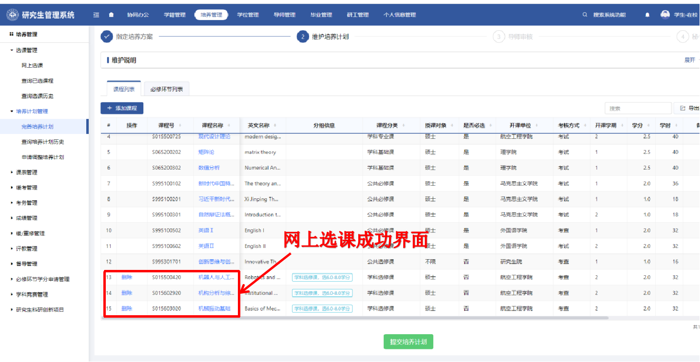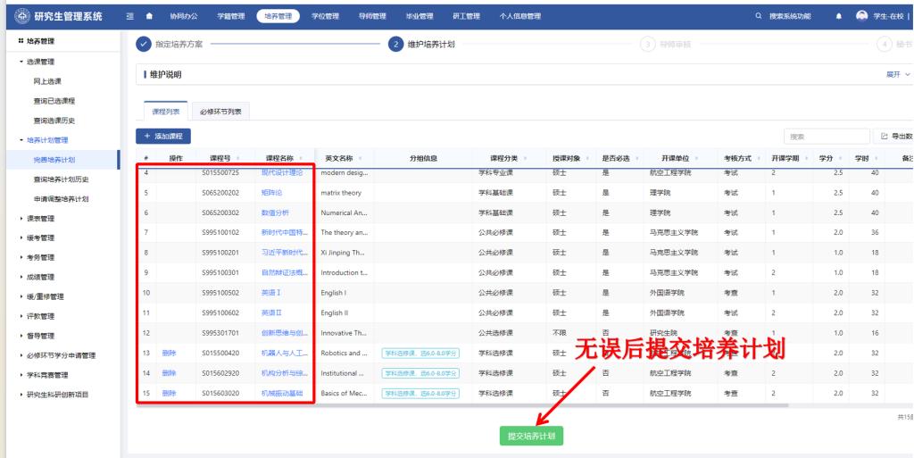 2.个人培养计划确定完成后(公共选修课、专业选修课、必修环节三部分全部完成)提交阶段将于10月8日下午13:00开放,10月11日上午11:00关闭,研究生须在规定时间内提交个人培养计划;