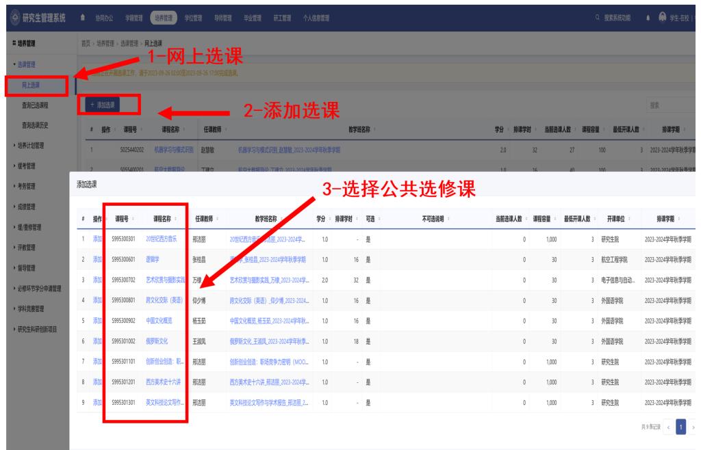 2025级硕士研究生在系统首页“培养管理”模块下,选择“选课管理”,依次点击“网上选课”-“添加选课”,根据个人兴趣确定所修公共选修课。