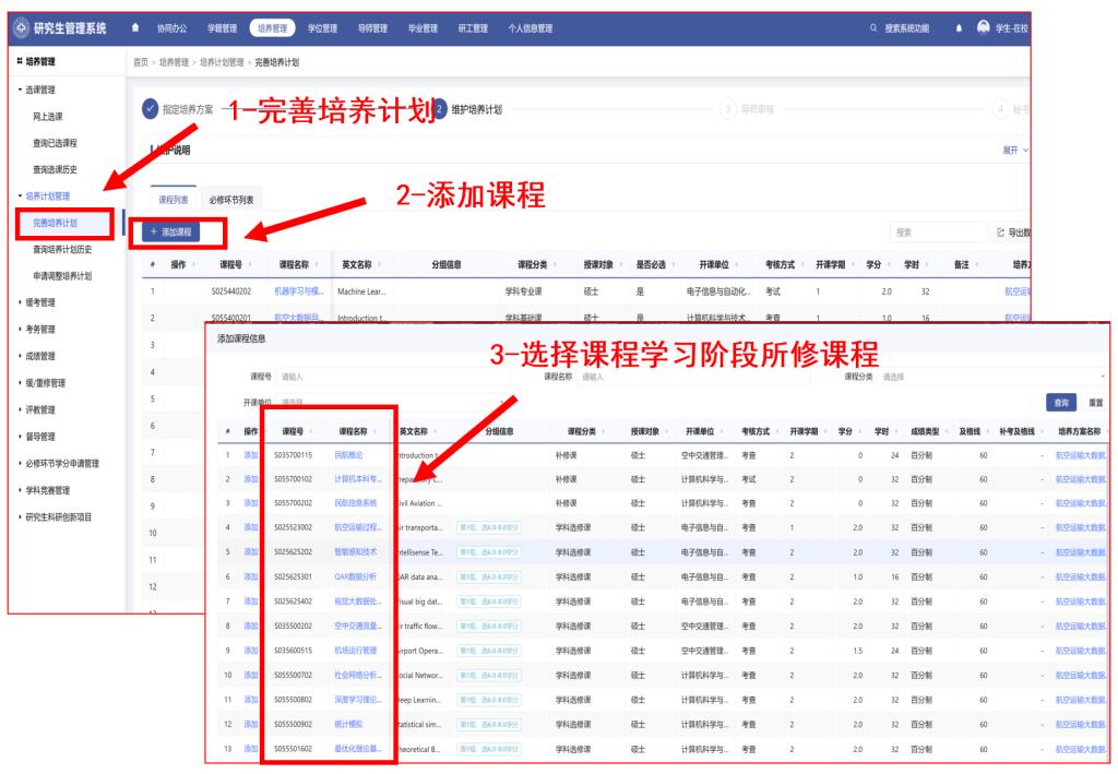 2025级硕士、博士研究生在系统首页“培养管理”模块下,选择“培养计划管理”,依次点击“完善培养计划”-“添加课程”,在导师的指导下按培养方案要求制定并提交个人培养计划。