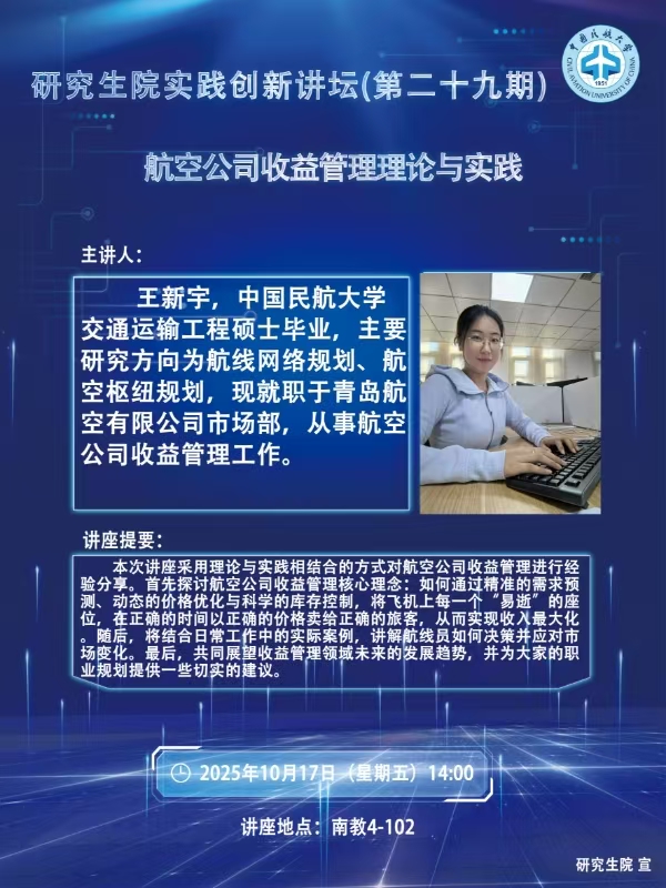 本次讲座采用理论与实践相结合的方式对航空公司收益管理进行经验分享。首先探讨航空公司收益管理核心理念:如何通过精准的需求预测、动态的价格优化与科学的库存控制,将飞机上每一个“易逝”的座位,在正确的时间以正确的价格卖给正确的旅客,从而实现收入最大化。随后,将结合日常工作中的实际案例,讲解航线员如何决策并应对市场变化。最后,共同展望收益管理领域未来的发展趋势,并为大家的职业规划提供一些切实的建议。